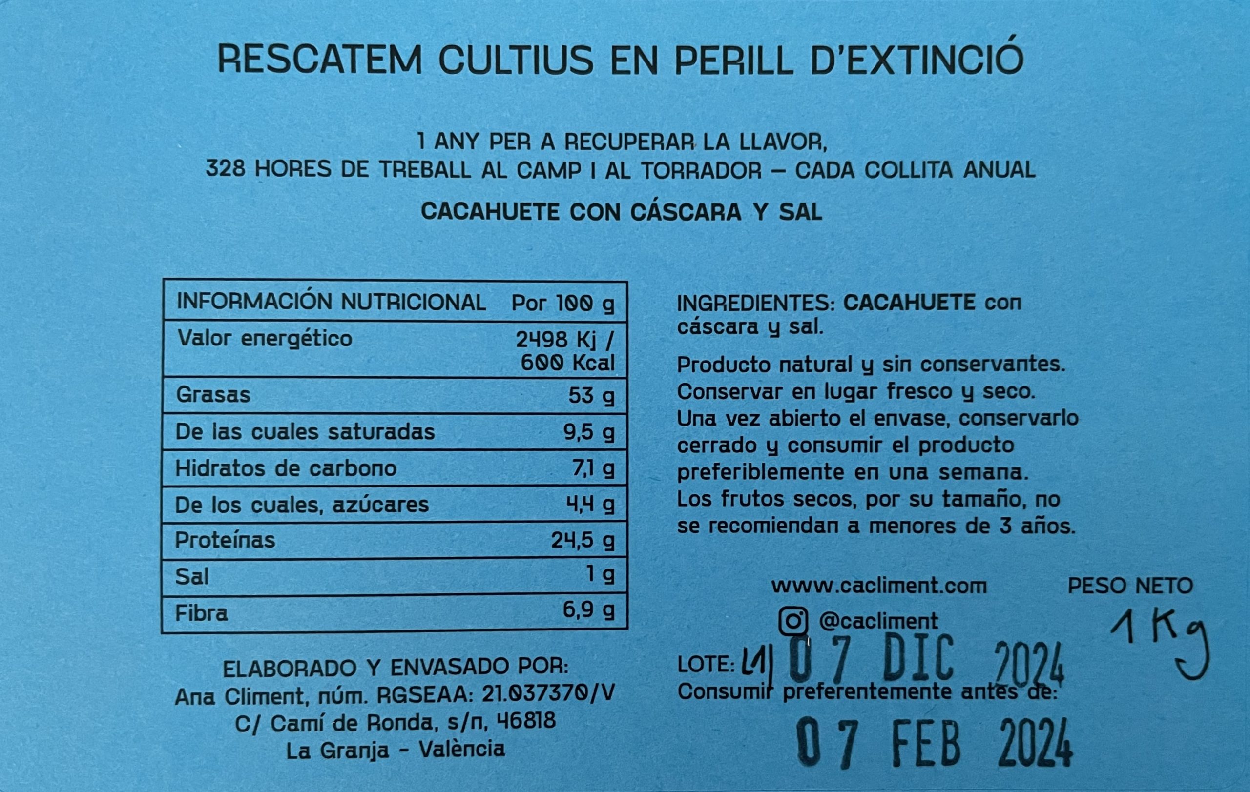 Cacaus Climent tostados en formato tarro de vidrio de 1 kg de las variedades tradicionales valencianas Collaret, Cacaua o mix de las dos variedades anteriores. Opción de elegir sabor con sal o sin sal.